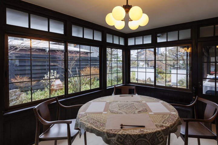 玄関で靴を脱いで上がるスタイルで、お家に招かれたような気分に。3面の窓からやわらかい光が差し込むサンルームや、落ち着いた雰囲気の広間の席で、くつろぎの時間が過ごせます。