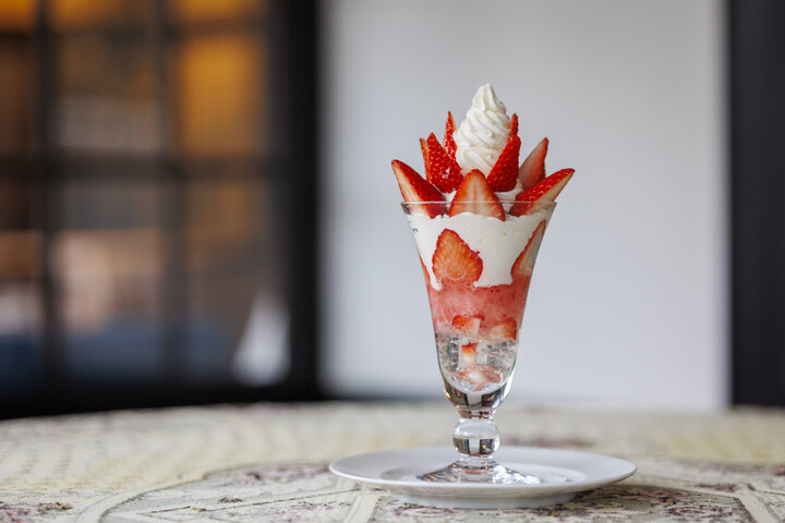 その時々の旬の果物を贅沢に使用してつくるパフェは、12月中旬~5月中旬頃まではいちごが主役。たっぷりのフレッシュいちご、いちごのジュレ、自家製のいちごジェラートとミルクジェラートを盛り合わせた華やかな一品です。