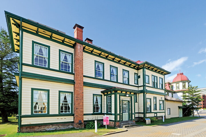 赤い屋根が印象的な洋館。喫茶室が入る洋館は無料で見学可能