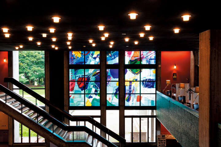 前川國男建築の弘前市民会館中2階にあるカフェ。大型のステンドグラス作品を眺めながら、食事やスイーツがいただけます。レトロな空間に包まれて、ゆったりと過ごして。