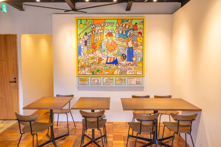 2階はカフェスペース。ベーグルをリベイクできるトースターも完備しています。アパレルを輸出入する専門商社が運営しているとあって、店内は洗練された雰囲気。アメコミ風のオリジナルアートも印象的です。