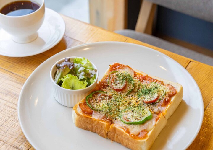 春から初夏にかけての爽やかな時期は、朝さんぽ途中のモーニングメニューがおすすめです。 ピザトーストにサラダとドリンクが付くセットは、とろりととろけるチーズが美味。また、四枚切りの食べ応えある食パンは、壬生のベーカリー「マンハッタン」のもの。京都中の食パンを食べ尽くし、そのなかから選りすぐったそうです。じっくり味わってみましょう。