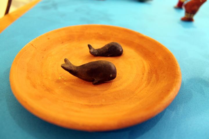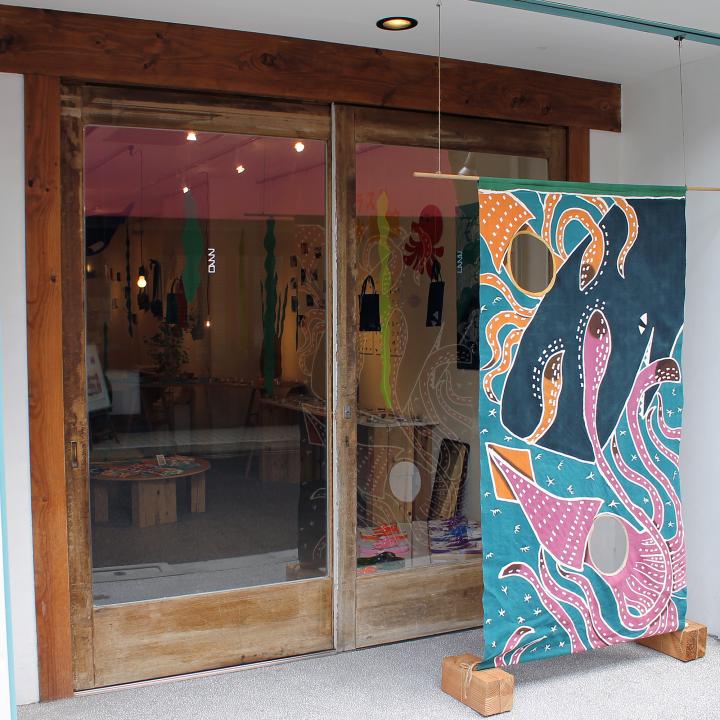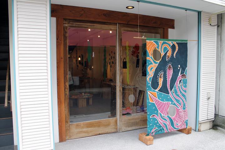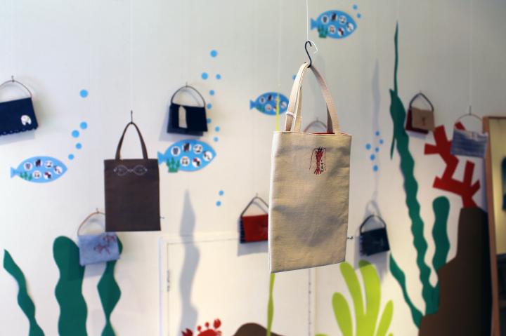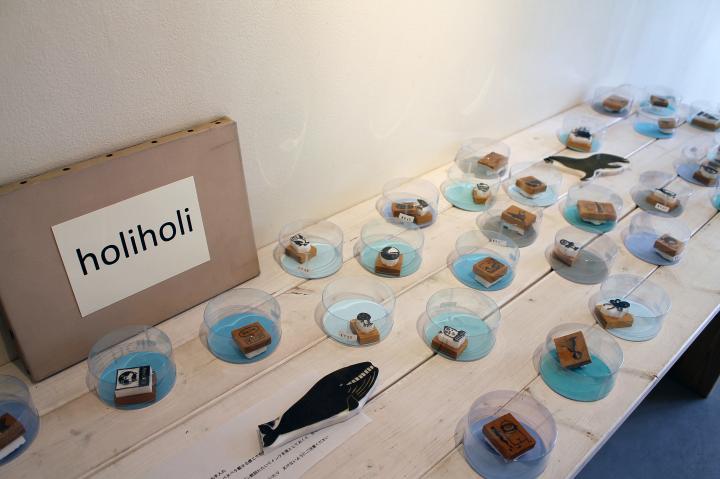 フラスコ水族館を作り上げた6組の作家さんたちの作品も、メインは海の生き物たちです。イカやタコ、クジラやイルカ、カニやエビ、カメ、ペンギンなどが、刺繍小物や消しゴムハンコ、小さな置きものに。注染てぬぐいも、無添加クッキーも、島ぞうりも、みんな海の仲間になっていました。ギャラリーを訪れる人に心から楽しんでいってほしい。そんな意気込みが作品から静かに伝わってきました。