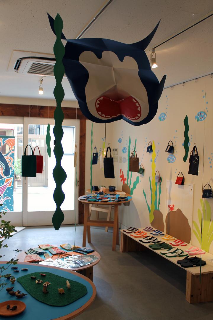 今回は、7月末から8月頭の週末に行われた「フラスコ水族館」の展示を訪れました。「どんな展示なんだろう?」期待を胸にギャラリーの扉を開けると、ギャラリーの壁では紙の魚たちが気持ちよさそうに泳いでいます。店内のあちこちではつり下げられた紙の海藻たちがゆらゆらと動き、天井には口を大きく開けたサメが。子どもはもちろん、大人も心躍る空間がそこにはありました。