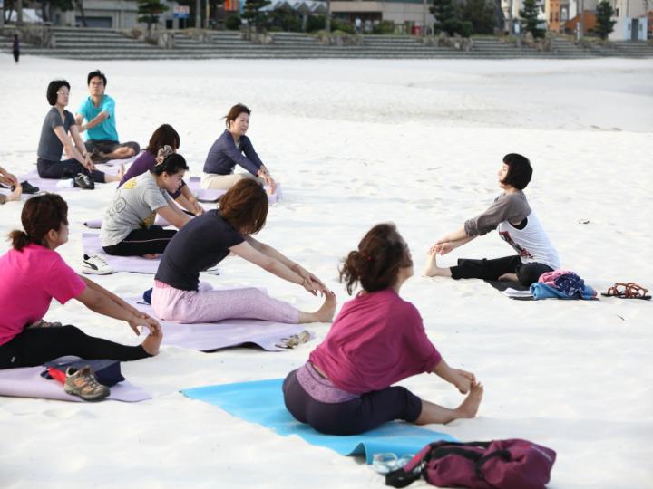 ビーチヨガのスタートは朝7時。白良浜に集合します。ヨガマットは貸し出してもらえるので、参加するときに用意するものはありません。動きやすい服装で参加しましょう。 海をバックにインストラクターの先生がポーズの説明など、初心者にもわかりやすく教えてくれます。 先生が美人でステキなのもポイント高いです! 参加者みんなでヨガの基本的なポーズをゆっくりととっていきます。 体が硬くても、問題ありません。できるポーズをできるところまでやってみましょう。