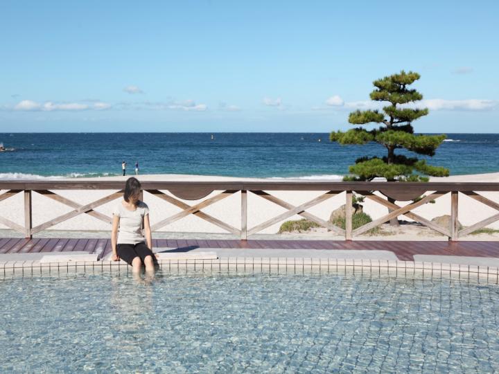 ビーチヨガのあとは足湯に入れるのがうれしいポイント。もし海風で少し冷えてしまっても、そのあとにしっかり足首を温めることができます。足湯の温度は夏場で38度ほど。ちょうどいい温かさです。