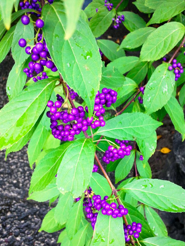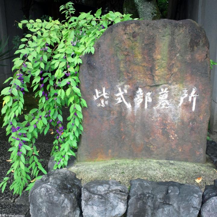 “ムラサキシキブ”と呼ばれる植物は、夏に可憐な淡紅紫色の花を咲かせ、秋になると美しい濃紫色の実をつけることから、その清楚で優美な実が紫式部の美しさと重ね合わせられて、いつしか“ムラサキシキブ”と呼ばれるようになったと伝えられています。 紫式部の墓の入り口に立つ茶色の石碑には、毎年秋になると“ムラサキシキブ”の濃紫色の実が彩りを添えて、かつての美しき女性・紫式部を偲んでいます。