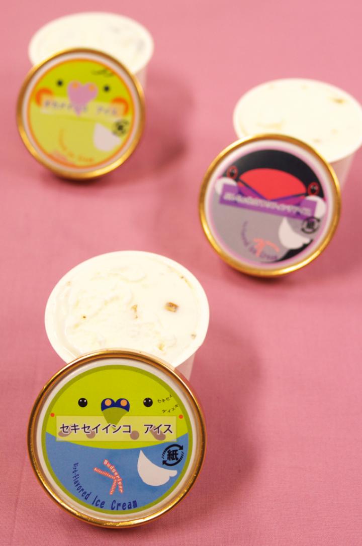 まずは「セキセイインコ アイス」から。 やさしい甘さのバニラアイスの中に押し麦のようなもの(きび、ひえ、粟だそう)とドライリンゴが入っており、食感がよく、食べやすいです。 次に「オカメインコ アイス」を試食。 こちらもベースはバニラですが、角切りドライリンゴが入ってフルーティです。女性数名から「この味好き」という声があがっていました。大きめの種も入っていて(ヒマワリとカボチャの種だそう)、見た目にもアクセントがあります。オカメインコの足が口の中に入った風味かどうかは・・・人それぞれの感じ方でしょうか。 最後に「ぶんちょ仕立てのフィンチアイス」をパクリ。 細かいマシュマロが入っているので、他のフレーバーの食感よりフワフワ。押し麦のようなもの(きび、ひえ、粟だそう)も入っていてアクセントになっています。もふ~っと丸くなった文鳥が感じられなくもないような・・・。