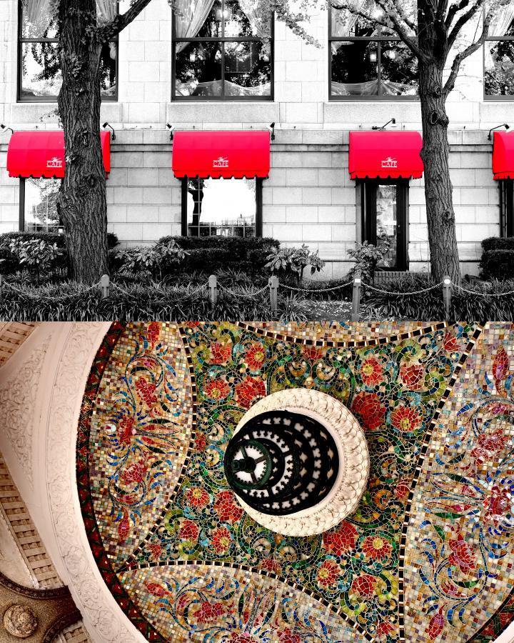 横浜といったら、何色のイメージを思い浮かべますか?おさんぽするだけで、たくさんの"色"に出合うことができます。 ホテルニューグランド「ザ カフェ」の雨よけは、通りをはさんでも目立つ、ひときわ真っ赤なコントラストが印象的。 「パートカラー」モードにすれば、選んだ色以外をモノクロにして、個性のある"色"を目立たせるアートな写真に生まれ変わらせることができます。 また、山下公園のインド水塔は天井にカラフルなタイルが一面に敷き詰められています。真下から「ダイナミックトーン」モードにして撮ると、1つ1つの"色"が際立った、一枚になりました。