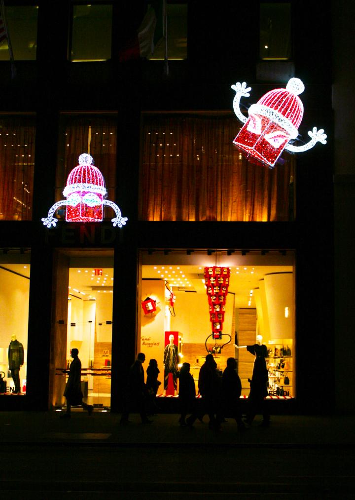 次に5番街沿いで楽しめるのが、カルティエ、ティファニー、ルイ・ヴィトンなど、高級ブティックの見事なウィンドウディスプレー。どのお店もそれぞれの個性を打ち出しており、見物です。写真はフェンディのディスプレイ。宙に舞うギフトボックス君たちがお茶目。