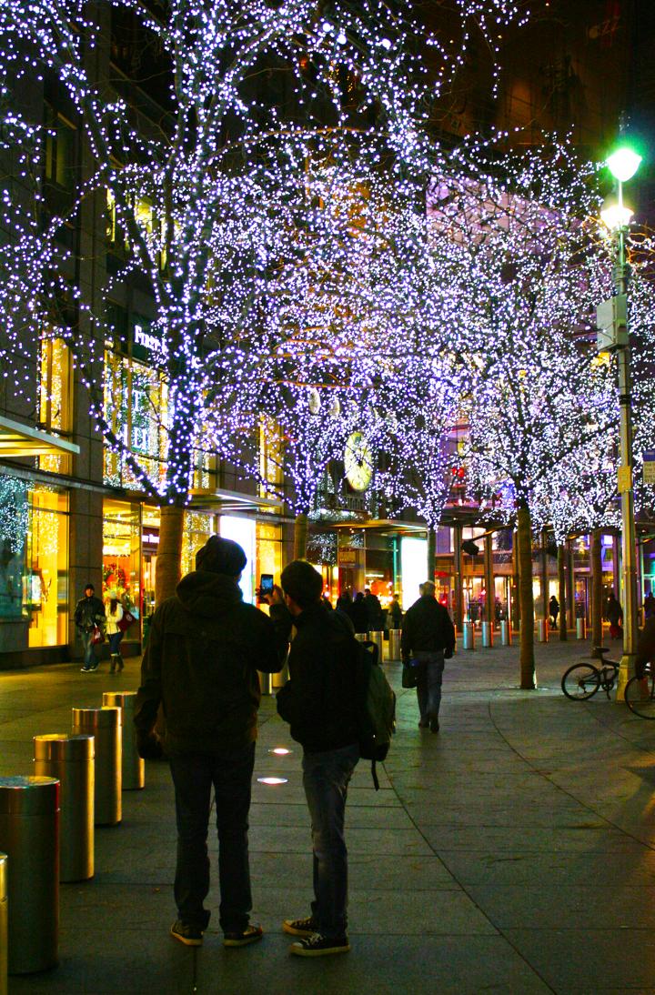 華やぐ5番街を後に、59丁目のコロンバスサークルへ。ランドマークでもあるタイムワーナーセンター周辺の街路樹も、この時期はまるで蛍を思わせる青い光に包まれます。いつもはせっかちなニューヨーカーたちも思わず立ち止まって見入ってしまいます。