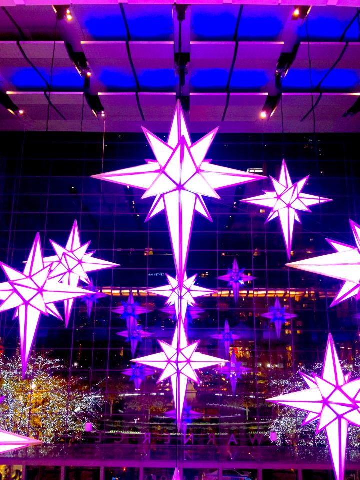 最後はタイムワーナーセンター名物の星のイルミネーション。吹き抜けの天井から吊るされた星形のライトは、時間の経過とともに色が変化するので、時間の経過も忘れてついつい見入ってしまうほど。 さて、いかがでしたか。この時期、ニューヨークのイルミネーションみどころはまだまだたくさんあります。どうか寒さにめげず街歩きを楽しんでくださいね。