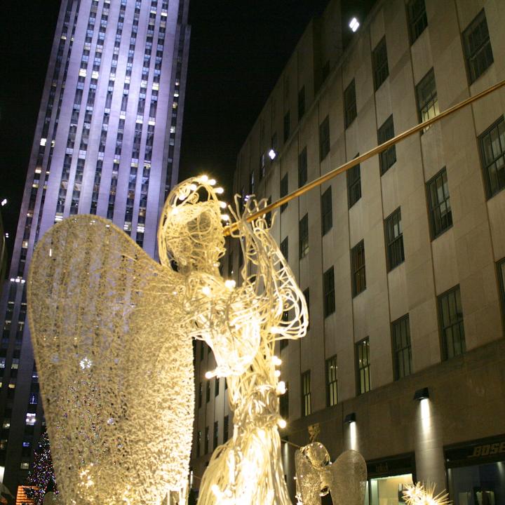 まずは毎年郊外から運び込まれるロックフェラーセンターの巨大ツリー。今年はコネチカット州の高さ23メートルのノルウェーもみの木が選ばれました。 12月4日夜の点灯式を経て、現在は飾り付けられた約4万5000個ものLEDの電飾が道行く人々の目を楽しませています。ツリーのてっぺんに燦然と輝くのは、スワロフスキー製のクリスタル星。地元ニューヨーカーはもとより、世界各国からの訪問者たちにとっても、ニューヨークのクリスマスを一番実感させてくれるシンボルの1つでもあります。 巨大ツリーを見ながらプロムナードを5番街に向かって歩いていくと、とにかく周辺はカメラを片手に記念撮影にいそしむ人々でさらに大混雑! それもそのはず、ここは巨大ツリーを背景に、光りに彩られた笛を吹く白い天使像が撮影できる人気スポットなのです。記念の一枚はぜひここで。(メイン写真)