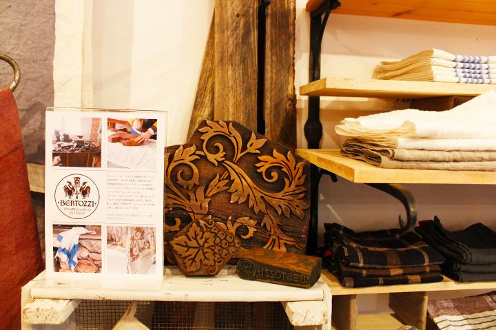 最近問い合わせがとても多いというのがイタリア、エミリア・ロマーニャ州の「BERTOZZI(ベルトッツィ)」のリネン。職人が1点1点手彫りで木製版型を作り、ハンドプリント、ハンドペイントしています。 店内にはその木製版型が置いてあり、目をひきました。1920年創業時から代々受け継がれているというハンドプリントの模様は、オリジナリティがあって美しいので、プレゼントにも良さそう。 スカンジナヴィアのピュア・ウール「Silkeborg(シルケボー)」のスローケットは、秋冬の人気商品で、思わず手にとって触りたくなります。ベッドカバーの上に広げたり、ひざ掛けにしたり、使い方は工夫次第。アルパカのニットもオススメで、ポンチョ風やスヌード風にして使えます。 リネン好きにはたまらなくて、リネンにあまり馴染みがない人でも、リネン・デビューしたくなるお店でした。
