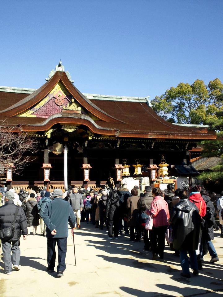 北野天満宮「終い天神」は、例年約15万人の参拝者で大賑わいとなり、正月が迫る縁日だけあって、神社では正月の祝箸やお屠蘇などの授与の他、露店にも〆飾りや荒巻き鮭など正月用品を商う店が目立ち、行き交う人びとにも年の瀬の慌ただしさを感じることができます。 早朝から賑わい始めて、午前9時から本殿において祭典が執り行われ、夜は太陽がすっかり沈んだ後も露店に明かりが灯されながら午後9時頃まで賑わいが続きます。