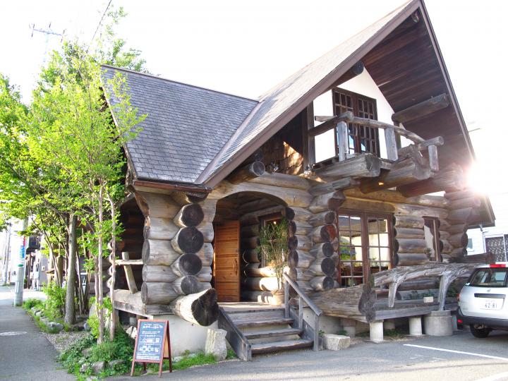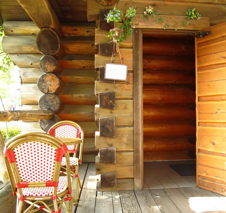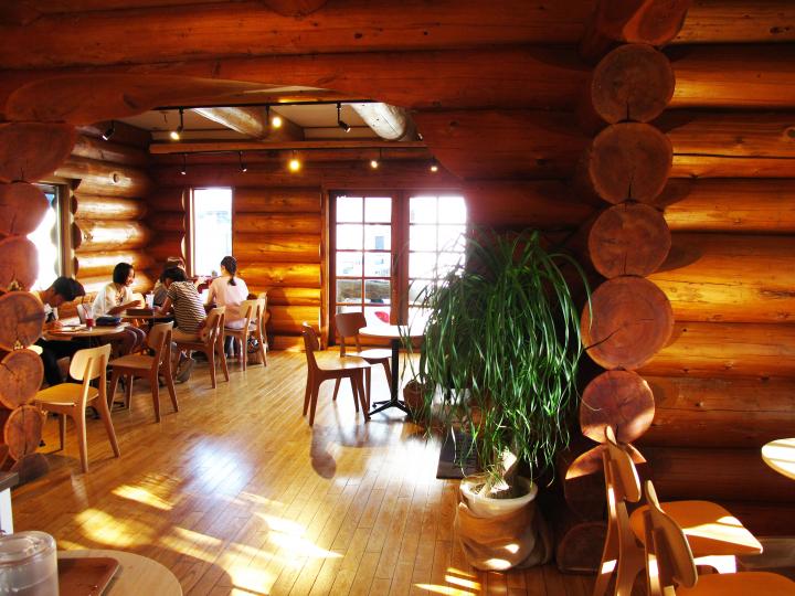 木のぬくもりあふれるログハウス調のカフェ