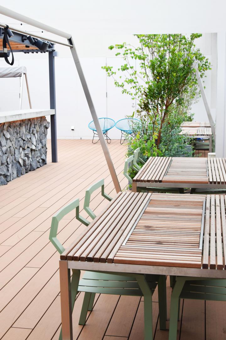 晴れた日には、外のテラス席もおすすめです。心地良い風を感じながら、ウッド調のテーブル席で食事を楽しみましょう。
