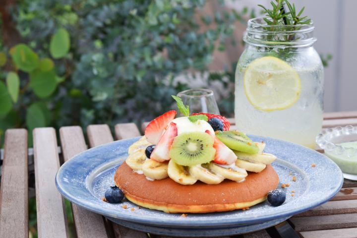 ホットケーキはボリュームたっぷりなので、2~3人でシェアするのもおすすめ。「ハーブ&レモンスカッシュ(648円)」は、自家製のレモンシロップを炭酸で割ったもの