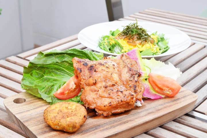 ランチメニューで人気なのが、「鶏もも肉のよっちゃんなんばんBBQプレート(1134円)」です。 鶏もも肉のおいしさの秘密は、宮城県北部・岩出山の「よっちゃん農場」という唐辛子農場で製造されている「よっちゃんなんばん」という調味料。唐辛子、麹、醤油を熟成させたこの調味料に数時間漬け込み、パリッと焼き上げた鶏もも肉からは、なんともスパイシーで食欲をそそる香りが漂います。じゅわっと染み出る肉汁と、甘辛い味わいが合わさり、クセになるおいしさです。