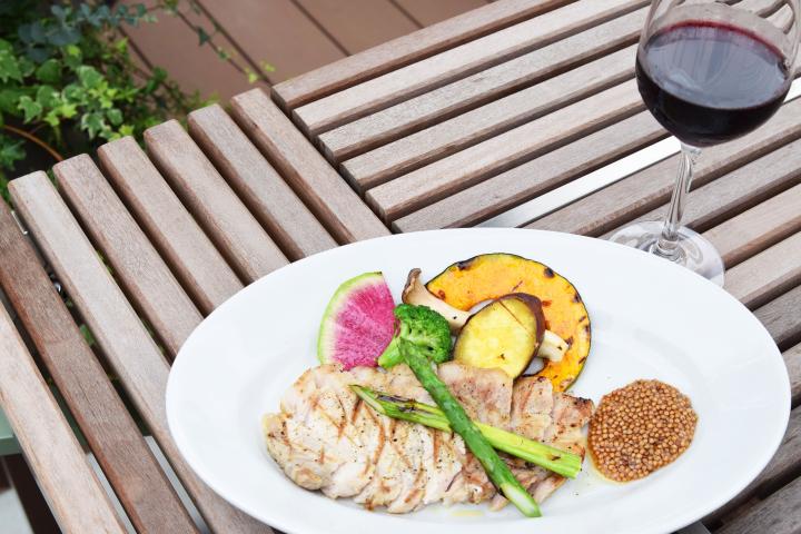 宮城県産のブランド豚を使った「伊達ざくらポークのグリル エゴママスタード添え(1598円)」はディナータイム(17:00~)の人気メニュー