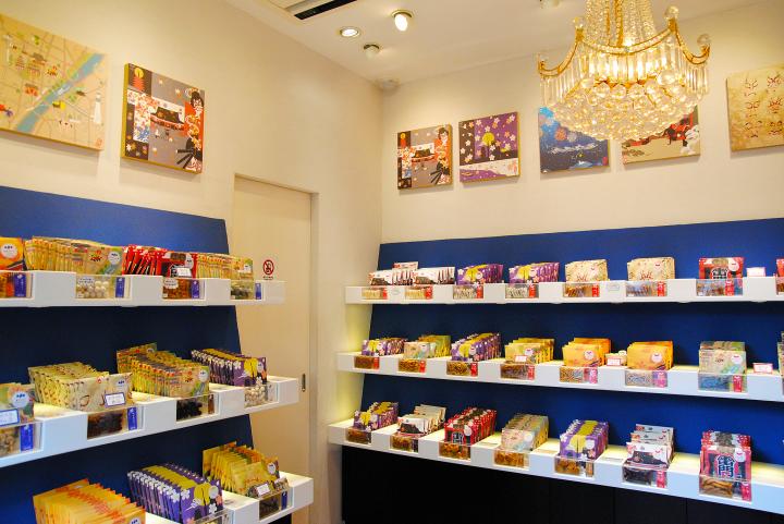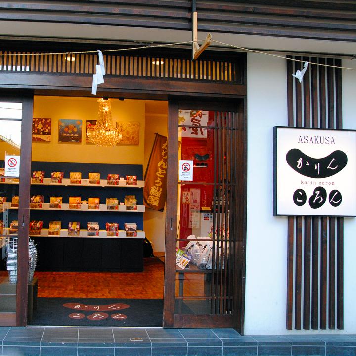 「浅草かりんころん」は、浅草の仲見世から徒歩10秒、伝法院通りに建つビルの1階にあります。この辺りでは珍しく、2012年にオープンしたばかりの新しいお店です。 店内はシャンデリアが飾られ、商品が雑貨のようにおしゃれに陳列されており、モダンな雰囲気です。