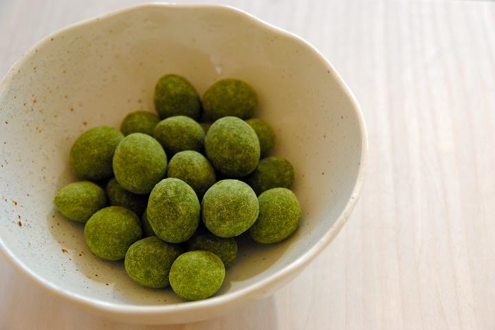 豆菓子は、そら豆、大豆、落花生をベースにしています。写真は、おすすめの「抹茶みるく」450円。落花生を抹茶とミルクでコーティングした、子供も大人も楽しんで食べられる、大人気の商品です。 お酒のおつまみ用に選ぶなら、ペーストにした枝豆でそら豆をくるっと覆い、わさび風味に仕上げた「本わさび」380円や、落花生に明太子と唐辛子の辛さをぴりりと効かせた「辛子明太子」がおすすめです。