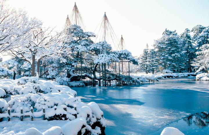 加賀百万石の粋を集める日本三名園のひとつ「兼六園」は、いわずと知れた金沢のシンボル。11万4000平方メートルもの広さがあり、歴史ある建物、大小の池や滝、小山、石などの配置は巧みで、大名庭園の美を心ゆくまで鑑賞できます。 5代藩主・前田綱紀に始まり、歴代藩主が莫大な財力を投資し、作庭し続けたそうです。「宏大(こうだい)、幽邃(ゆうすい)、人力、蒼古(そうこ)、水泉(すいせん)、眺望(ちょうぼう)」の六勝を兼ね備える庭として、1822(文政5)年、「兼六園」と命名されたと言われています。 そして四季折々の美しさを見ることができるのもこの庭園の魅力。 桜色に染まる春、緑萌える夏、錦に彩られる秋、そして銀世界の冬。 樹木が雪の重みで傷まないように支える「雪吊り」は北陸の冬の風物詩です。その少し不思議な風景に思わず見入ってしまいます。 今年は1月31日から2月9日までの期間17:30~21:00までライトアップも行われる予定で、より幻想的な景色を楽しむことができますよ。ちなみに「雪吊り」は、春の音が聞こえだす3月中旬頃には取り外しが始まり、一週間ほどでもとの姿に戻ります。 ○兼六園 [TEL]076-234-3800(石川県金沢城・兼六園管理事務所) [時間]7:00~17:00(3月1日~10月15日までは~18:00) [休]無休 [入園料]300円