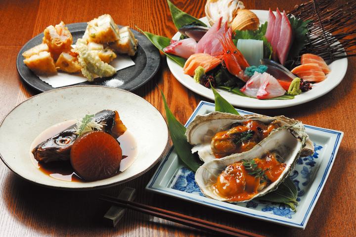 加賀れんこんのはさみ揚げ700円、刺身盛り合わせ(2人盛)2200円、ぶ り大根700円、能登のカキの味噌焼1000円