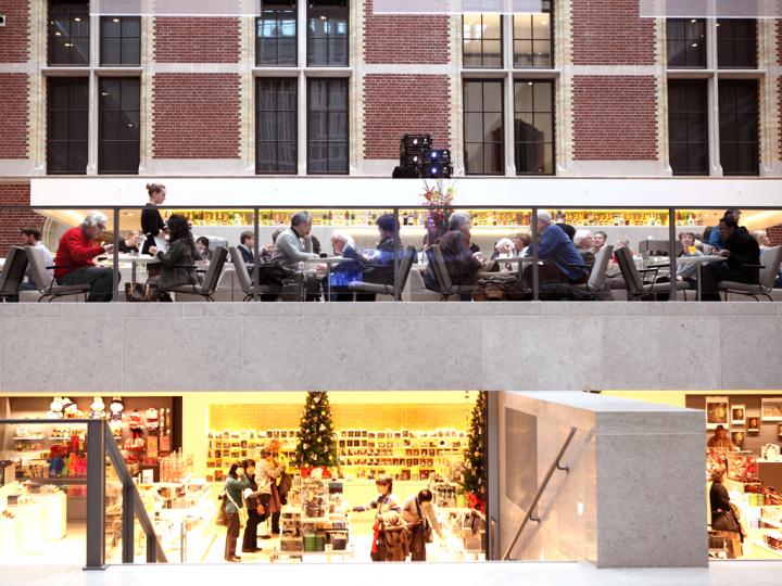 帰る前にはミュージアムショップのチェックもお忘れなく。いろいろなアートグッズが並びます。 図録やポストカード、作品のレプリカはもちろん、フェルメールの『牛乳を注ぐ女』の紙ナプキンやマグカップ、レンブラントの『夜警』の柄の傘など、ちょっと目を引くグッズの数々はおみやげにもおすすめ。 また広い館内を歩いたあとはモダンなカフェで休憩を。ミュージアムショップの真上にはシックなインテリアでまとめられたおしゃれな空間が広がります。明るく広々としたカフェでくつろぎながら、ゆったりした時間を過ごしましょう。 絵画鑑賞が趣味の方はもちろん、普段美術館に足を運ぶことがない方にもおすすめなアムステルダム国立美術館。アムステルダムに旅行へ行く際には、新しく生まれ変わったこの美しいミュージアムへ足を運んでみてくださいね。
