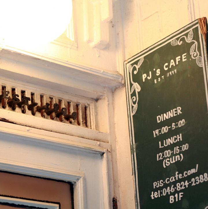 京急横須賀中央駅から徒歩約10分。横須賀基地からほど近く、日本とアメリカの雰囲気が融合したどぶ板通りの外れにある、レストラン「PJ's cafe」。 ヨーロッパの小さなアパートをイメージして作られたというこちらのお店は、かわいらしい真っ白な扉を開けて階段を降りた、地下1階にあります。 店内には心地よいジャズが流れ、家具はアンティークで揃えられています。「日常とは少し違った時間を過ごしてもらいたい」というオーナーのセンスが反映されていて、とっても落ち着く空間です。