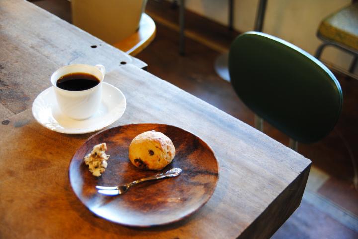 今回おじゃましたのは「珈琲の樹 LAT36°N」(月曜休)のオープン時。こちらのお店は、なんといっても世界各国から厳選したコーヒーがおすすめ。 旅好きでハンチング帽が似合うおしゃれなマスターが、中南米、アフリカ、アジアなど、世界中から仕入れた豆を焙煎から行ない、丁寧に淹れてくださいます。 コーヒー以外にも、コーヒーリキュールのお酒、豆乳のチャイなど、ドリンクを中心にパンなども食べられます。 写真は、マスターの高校の同級生、旅するパン屋さん「ツキモバザール」のスコーンに、本日のコーヒーがついた「天然酵母のツキモバザールスコーン ブレンドセット」550円。 こちらのお店ではイベントも盛んで、「世界一高価な魅惑の珈琲~コピ・ルアク~ 飲もう会」や「下町の粋 民の旅 演芸会」など、食のイベントから音楽イベント、若き政治家の講演会まで、幅広く開催されています。 いつも誰かしらおもしろい人に出会えるお店なので、気軽に1人で訪れてみて。