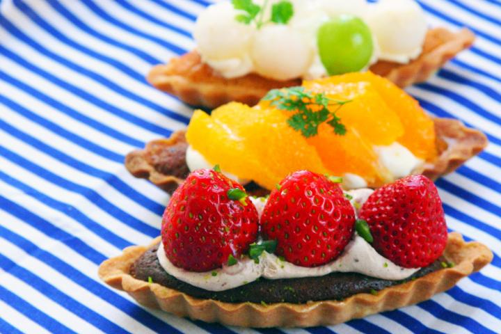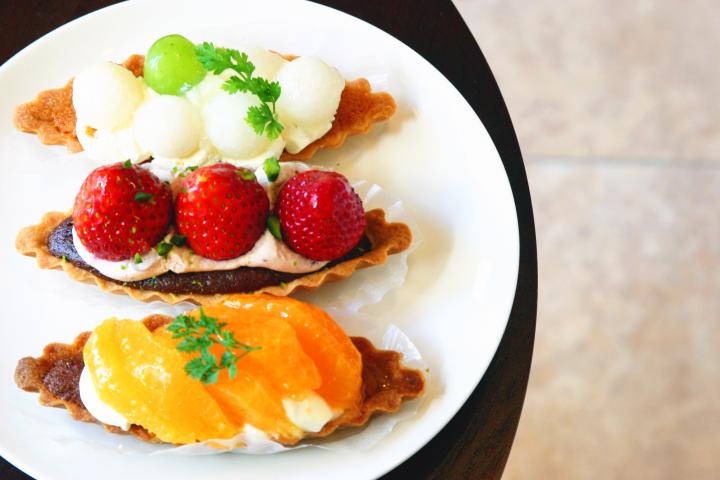 手前から「愛媛の三種柑橘のタルト」(300円)、「いちごショコラタルト」(350円)、「晩三吉(梨)のタルト」(300円)。小さなタルトは180円~