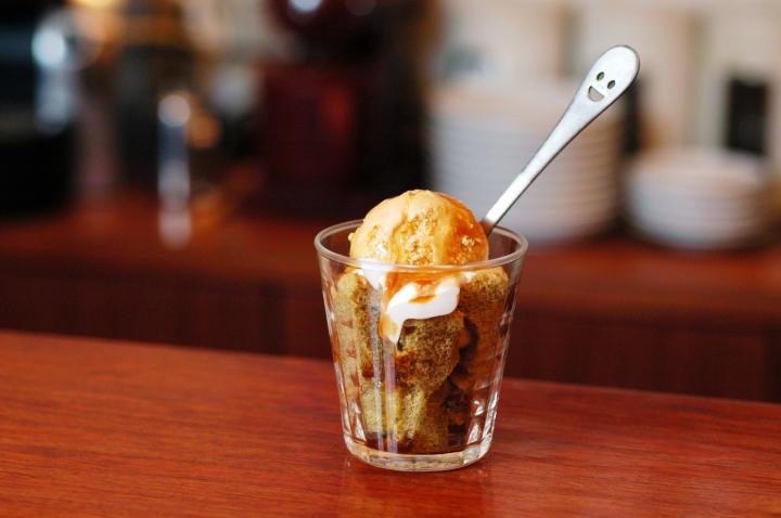3種類のスイーツメニューとドリンクは奥さまの担当です。もともとケーキ教室を開いていたほどの腕前で、アイスやソースまですべて手作り。ふんわりして風味のあるシフォンと、ビターでコクのあるカラメルがマッチしたシフォンサンデーは、これだけを目当てにくるお客さんがいるほど。カレーのあとに食べると、おいしさも倍増です。 たっぷりの野菜をベースにしたかえる食堂のカレーは、とってもヘルシー。体の中から元気になれますよ。