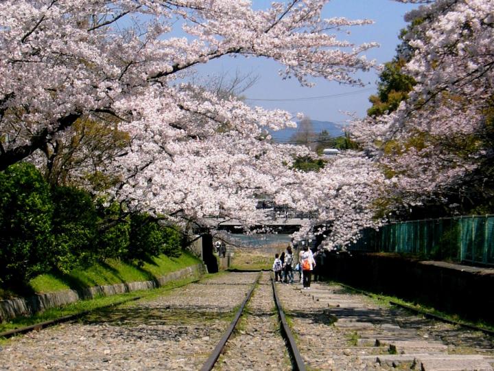 琵琶湖疏水に浮かぶ十石舟の乗船場から振り返ってみると、すぐ近くに「インクライン」と呼ばれる傾斜鉄道の線路跡があります。かつて疏水は運搬船を浮かべて水運にも活用された歴史があり、蹴上付近において水面に高低差が生じるため、ゆるやかに船を上げ下げするために傾斜鉄道が設けられていました。 春になると、インクラインは空を覆い隠すほど桜が咲き誇り、線路跡を歩いてみると、まるで桜のトンネルに入ったかのような素敵な桜風景が続きます。 ○インクライン [所]京都市左京区南禅寺福地町