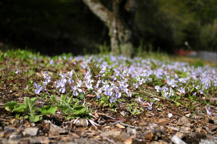 日影沢を彩るスミレとニリンソウ