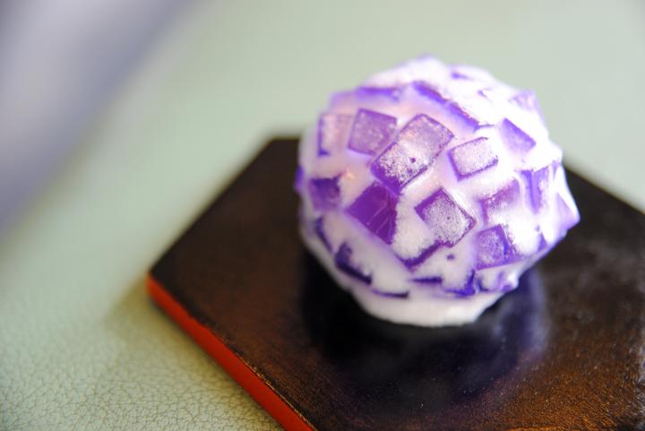 こちらは釣りなどで使う竹籠“びく”に、鮎が飛び込む様子を表現した「びく」270円。 白あんに白玉粉を練り込んだ和菓子で、中には北海道十勝産のなめらかな黒のこしあんが詰まっています。こちらは6月下旬までの販売予定。 さらにメインカットは「あじさい」248円。中に白あんを詰め、綿玉(寒天)をメレンゲでふんわりと仕上げた、何とも可愛いらしい見た目です。こちらも6月下旬頃までの販売を予定しています。