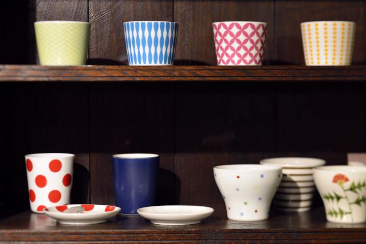 ポップな模様の波佐見焼。神秘的な緑色の釉薬がかかった伊賀焼の作家ものも数多く展示・販売されています