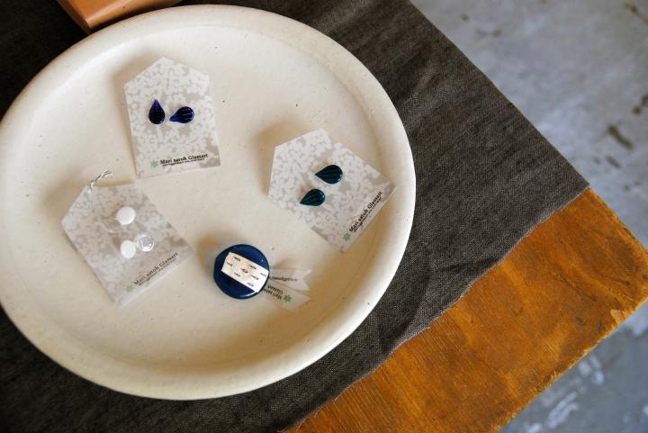 こちらはガラス作家のさとうまりさんが作った、夏にぴったりな涼しげな作品です。左「ふたつぶのピアス」1350円、中央上右「しずくのピアス」1458円、下「ブローチ青」1728円。「cheer」の服ともよく合いそうですね。 お店に置かれている作品は、どれも作家さんの人柄ややさしさを感じるものばかり。愛情を込めて作られた作品が、ここにはギュッと集められているので、じっくりお店で選んでみて。