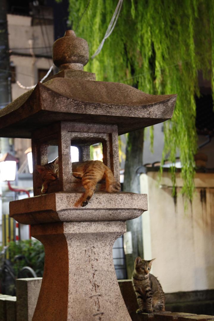 天気の良い朝は、日当たりの良いところでお昼寝する猫が、暑い日の夜は涼しい場所を見つけては寝ています。 石の触感が冷たいからなのか、石灯篭で眠りにつく猫もいて、通りすがる人々を笑顔にします。 〇法善寺横丁 [所]大阪市中央区難波 [URL]http://houzenji.jp/