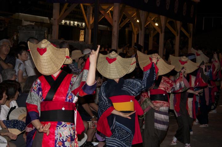 「西馬音内盆踊り」が行われる羽後町西馬音内地区へは、JR湯沢駅からタクシーで15分、路線バスだと25分。山々と田圃が夕焼けに染まる車窓の景色が、“日本の原風景”を思わせ、心が和みます。 古くからの商店が軒を連ねる西馬音内の中心部に足を踏み入れると、静かな光景は一変。篝火が焚かれた本町通りには、テンポのよいお囃子と力強い歌声が響き渡ります。 観光客の人垣に近づくと、顔を半月型の編み笠で隠し、艶やかな衣装を身にまとった踊り手が目に飛び込んできました。勇ましいお囃子とは対照的に、踊りは流れるように麗しく、独特のしなやかな手の動きは目を奪われる美しさです。踊りの輪の中には、「亡者」を表すといわれる、彦三(ひこさ)頭巾と呼ばれる黒い布をかぶった踊り手も混じり、妖しくも神秘的な雰囲気を漂わせています。まるで、幻の世界に迷い込んだような不思議な気持ちになりながら、しばし踊りを見続けます。