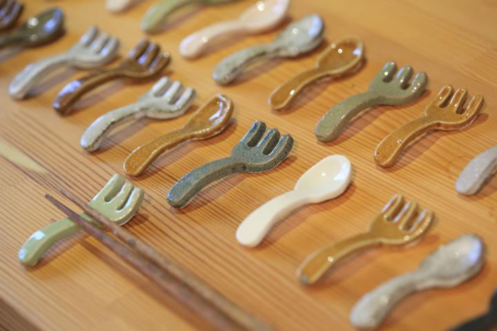 住宅街の中にある、工房に併設した小さなギャラリー。ふだん使いにぴったりなうつわがずらり。同じデザインでも微妙に形が違うので、自分好みのものを探して。シンプルな中にもアクセントのあるものが多く、とくにフォークとスプーンをかたどった箸置きはなんともキュート。価格も手頃で、作家もののうつわに触れてみたい人にもぴったりです。 ○テーブル雑貨リスの木 [所]岐阜県多治見市滝呂町9-152-57 [TEL]0572-24-5448 [時間]10:00~18:00 [休]日・月曜 [P]3台 [HP]http://risunoki.com/shop.html