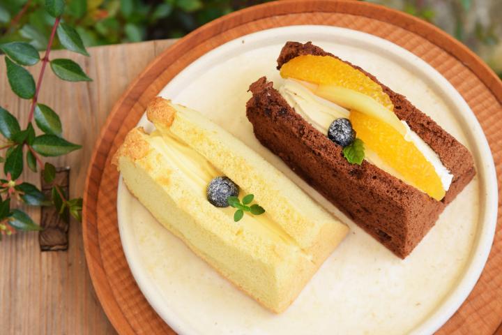 フルーツと生クリームをトッピングした「シフォンショート(432円)」は、華やかで手みやげとしてもおすすめ。チョコシフォンにはさんだコクのある生クリームは、北海道産の生乳が原料。中には輪切りにしたバナナが隠れています。 また、「カスタードシフォンサンド(378円)」は、自家製カスタードクリームをはさんだスペシャルメニュー。卵の黄身が余った時だけ登場します。プレーン味のシフォンが、とろりとしたクリームのやさしい卵の香りを引き立てます。