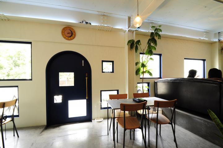 スペインの街角に佇んでいそうな、いろんなかたちの窓があるカフェ