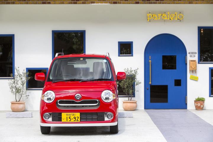 大小いろんな窓がはめ込まれた目を引く外観。ミラ ココアとのトリコロールカラーがかわいいです
