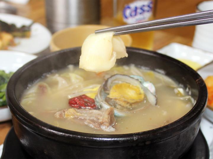 南漢山城のロータリー近くにある料理店「コヒャンサンチョン」では、ここでしか食べることのできない『暁鐘羹(ヒョジョンゲン)』というへジャンクが味わえます。へジャンクとは、お酒を飲んだ翌日にいただく酔い冷ましのスープのことで、疲れた胃腸を癒してくれる体に優しいスープです。 こちらの暁鐘羹は、数年前に発見された、朝鮮時代の貴族、両班(リャンバン)が食べていたレシピを忠実に再現していて、韓国のニュースに取り上げられたほど、話題のメニューなのです。 両班が食べていたとなると、おのずと豪華な食べ物だったということがイメージできるように、スープにはアワビ、なまこ、牛カルビ、松茸といった高級食材が入ります。これらの食材を24時間以上煮込み、旨味が存分に引き出された白濁スープは、滋味溢れるなんとも複雑で贅沢な味がします。 たくさんの具がひとつのスープの中に入り、手間暇かけて作られているかと思うと感謝せずにはいられない、ありがたいスープです。 ○コヒョンサンチョン [所]京畿道広州市中部面山城里509-1 [TEL]031-742-7583 [時間]10:00〜21:00 [休]無休