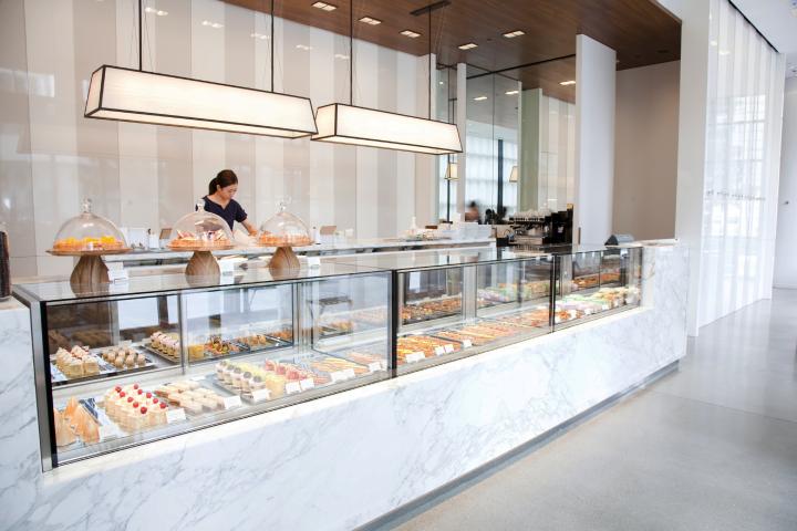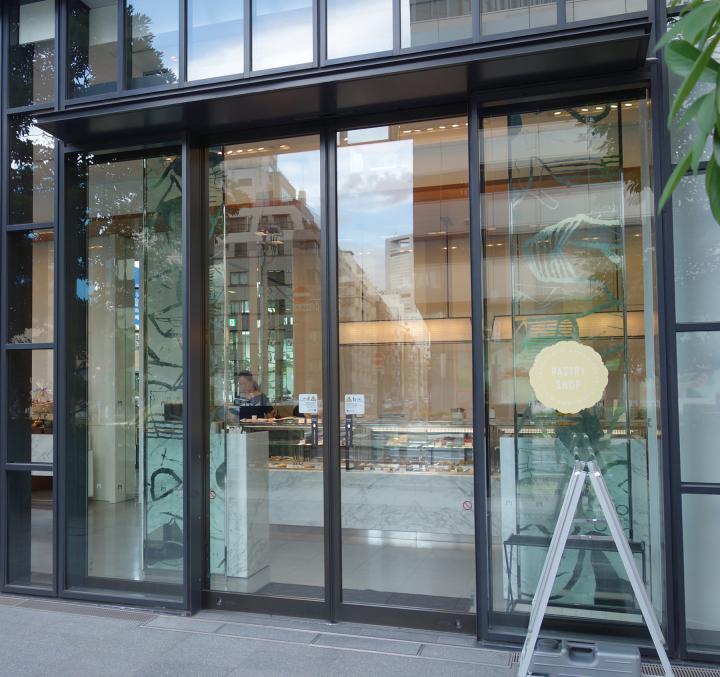 東京メトロ虎ノ門駅や神谷町駅、霞が関駅などの主要駅から虎ノ門ヒルズを目指して数分歩くと、愛宕下通りに面した「ペストリーショップ」が見えてきます。 ガラス張りの大きなカフェスペースには陽が注ぎ、開放的で明るい雰囲気。店内に静かに流れるクラシック音楽や、ゆったりした無垢材のコミュニティテーブルが優雅で、とても居心地の良い空間です。 大理石で出来たショーケースの中には、国際製菓コンクールで優勝経験もあるペストリーシェフ・岡崎正輝さんによる、カラフルなエクレアや旬のフルーツを使ったケーキなど、創造性あふれる様々なスイーツが並びます。