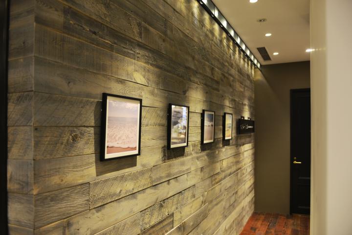 ウッディな壁にかけられたアートをやわらかい光が照らし、リラックスムードが高まります