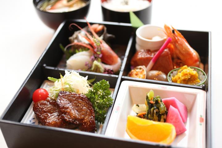 季節の「松花堂弁当」(2500円 税別)には、酒田港に揚がった新鮮な海鮮や県産の和牛などが入る