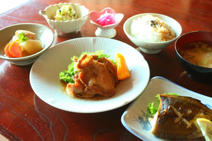 昼膳1050円。りんごの甘ダレで焼き上げた庄内豚やクチボソカレイの塩焼きなど、ご飯がすすむ日替わりおかずが並びます