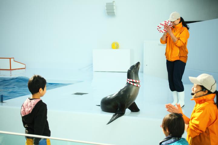 次々と特技が繰り出されるほのぼのとしたアシカショーは子どもたちに大人気(冬期は休み)